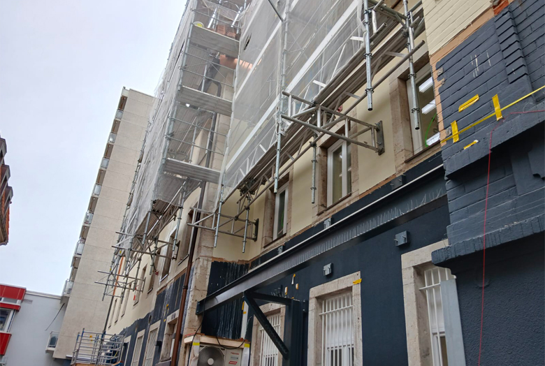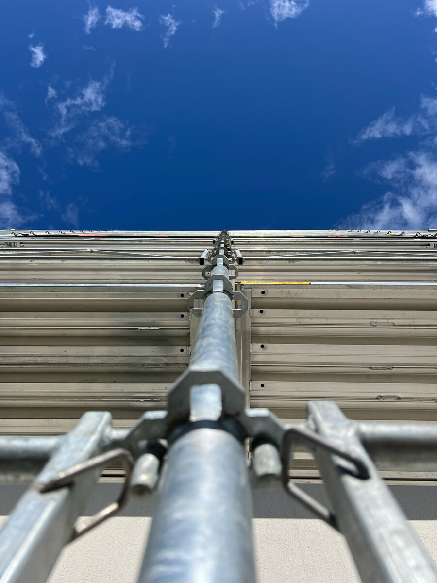 - Échafaudage à poutres à aiguilles: Utilisé pour des travaux légers, il repose sur deux poutres horizontales soutenues par des câbles ancrés au bâtiment.